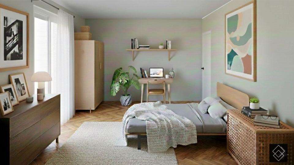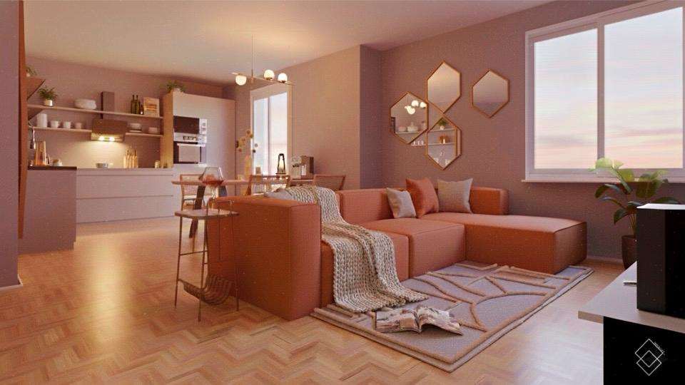 Le immagini pubblicate sono render di progetto e mostrano una possibile trasformazione dell’immobile in una soluzione moderna e funzionale.